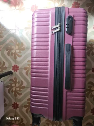 Maleta de viaje MSR POLO con capacidad para 23kg. Diseño moderno y resistente,es la mediana, utilizada sólo un viaje. - Color morado. - Ruedas para fácil transporte. - Textura exterior con patrón geométrico.