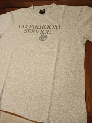 Camiseta de manga corta de la marca Pull&Bear. - Diseño con estampado CLOAKROOM SERVICE en la parte delantera. - Detalle de un sello circular con 1991 CLOAKROOM SERVICE LONDON en el centro.