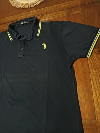 Camiseta tipo polo de la marca Top-Star. Presenta un diseño clásico con cuello y detalles en las mangas. - Logo bordado en el pecho. - Cuello con ribete a rayas amarillas y blancas. - Cierre de dos botones.