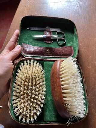 Estuche de manicura antiguo con un diseño de piel con textura. - Piel con acabado tipo cocodrilo. - Cierre de cremallera. - Detalle de logo grabado en relieve.