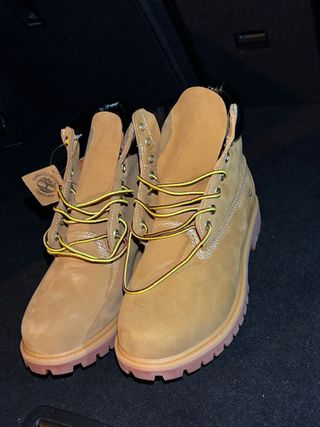 Botas Timberland clásicas en color amarillo y negro. - Talla 42. - Diseño robusto y duradero. - Cordones amarillos. - Cuello acolchado para mayor comodidad.