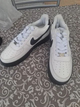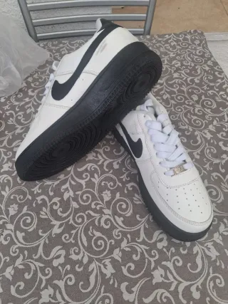 Zapatillas Nike Air Force 1 con un diseño clásico y versátil. - Combinación de colores blanco y negro. - Cierre con cordones blancos. - Detalle del logo Swoosh en negro. - Precio negociable!
