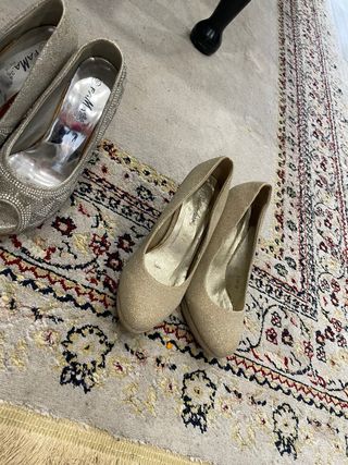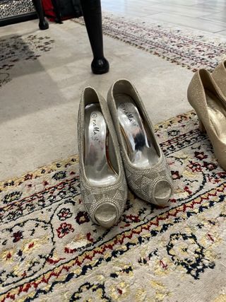 Elegantes tacones de fiesta con un diseño brillante. - Detalle de pedrería. - Punta abierta. El dorado usado 2 veces Y el plata 1 vez y es el de fama y el otro no se que marca es PRECIO NEGOCIABLE
