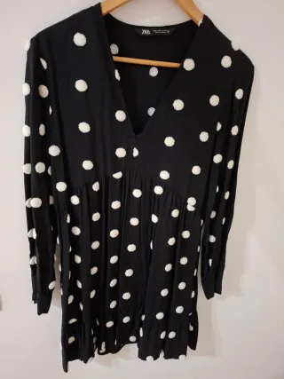 Vestido de Zara con un estampado de lunares clásico. Ideal para lucir un estilo chic. - Manga tres cuartos. - Diseño cruzado en la parte delantera. - Cintura elástica. - Falda con volantes en capas.