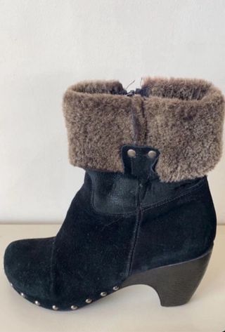 Botín de ante negro con forro interior. - Detalle de tachuelas en la puntera. - Tacón de cuña. - Ribete de pelo en la parte superior.