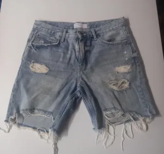 Pantalón corto de estilo desgastado, perfecto para un look casual. - Diseño con rotos y deshilachados. - Tiro medio. - Pierna recta.