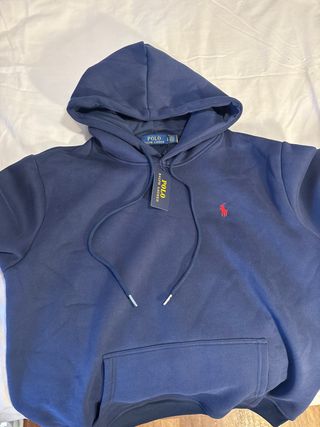 Sudadera con capucha de Polo Ralph Lauren en color azul marino. Presenta el icónico logo del caballo bordado en rojo en el pecho. La vendo ya que me queda pequeña