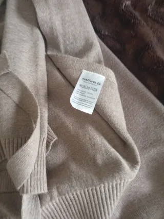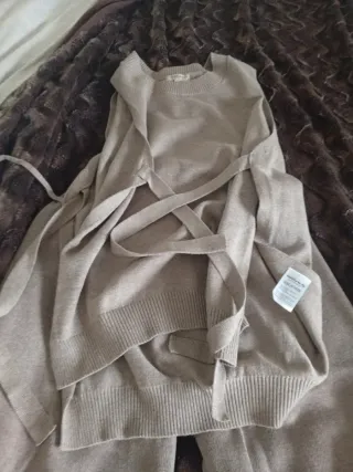 Conjunto de punto en color beige, ideal para cualquier ocasión. Es una pieza versátil y cómoda. - Tejido suave al tacto. - Diseño elegante y moderno. - Incluye cinturón para ajustar a la cintura.