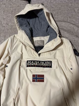 Chaqueta estilo anorak de la marca Napapijri. Con forro polar interior. - Color beige con detalles en gris. - Capucha ajustable. - Bolsillo frontal tipo canguro. - Cremallera parcial en el cuello. - Puños elásticos.