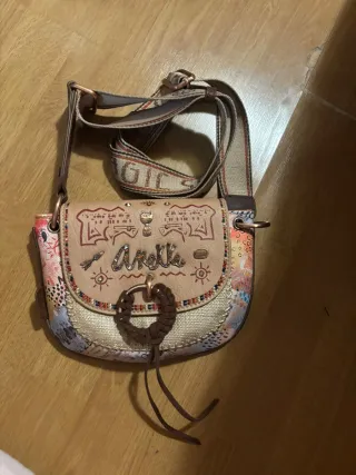 Bolso de la marca Aneke con un diseño único y llamativo. - Combinación de colores beige y multicolor. - Adornos y detalles decorativos. - Correa ajustable para llevar al hombro o cruzado.