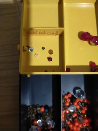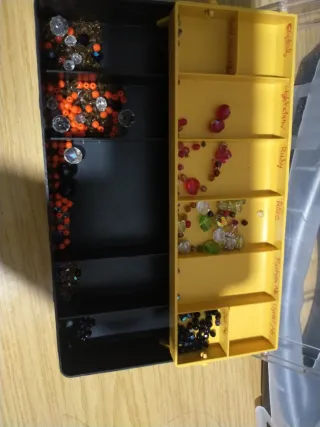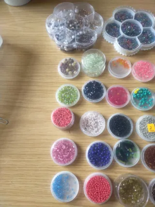 Lote de abalorios de diferentes colores y tamaños, perfectos para manualidades y bisutería. - Variedad de tonos y acabados. - Ideal para crear diseños únicos. - Contiene múltiples recipientes con abalorios.