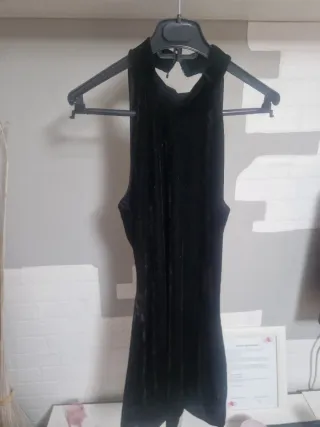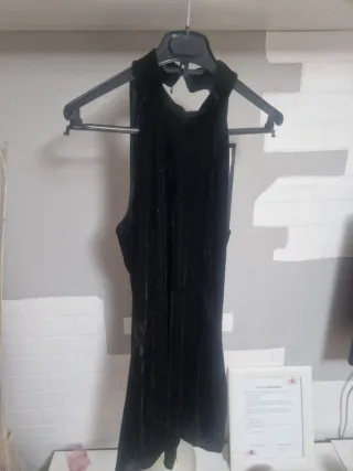 Vestido negro de terciopelo con un diseño elegante. - Tejido suave y brillante. - Corte sin mangas. - Detalle en el cuello.