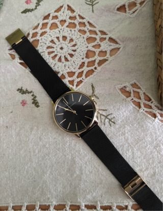 Elegante reloj de pulsera con un diseño moderno. - Correa de malla. - Esfera redonda. - Detalles en tono dorado.