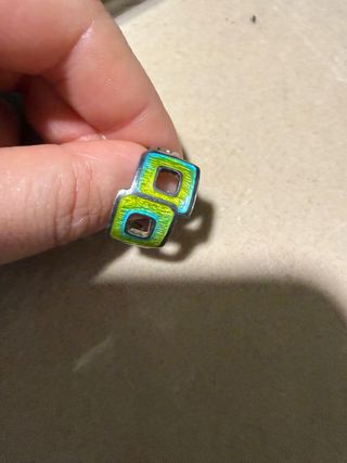Anillo de plata con un diseño moderno y llamativo. Presenta un esmalte en tonos verdes y plateados que le da un toque único. - Material: Plata - Diseño: Doble cuadrado entrelazado - Acabado: Esmalte brillante. Si medi buen mide eso