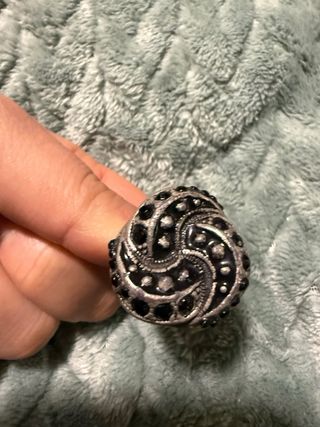 Anillo con un diseño llamativo y detalles en color negro. - Acabado plateado. - Adornos negros incrustados.