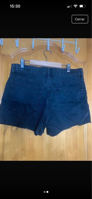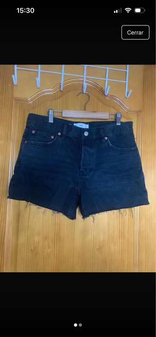 Shorts vaqueros de corte recto con acabado deshilachado. - Cintura alta. - Cierre de botones. - Bolsillos delanteros y traseros.