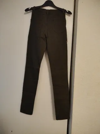 Pantalón vaquero de corte recto en color verde. Presenta un diseño desgastado en las rodillas. - Tiro alto. - Cierre de cremallera y botón. - Bolsillos delanteros y traseros.