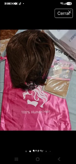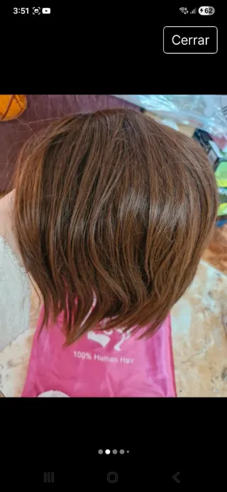 Peluca de cabello humano en tono castaño. Incluye una bolsa de tela para guardarla y una gorra para peluca. - 100% cabello humano. - Bolsa de tela rosa. - Gorra para peluca incluida 145€ cada una. Lote pestañas 45€ Pelucas largas 35€ Pelucas cortas 25€.