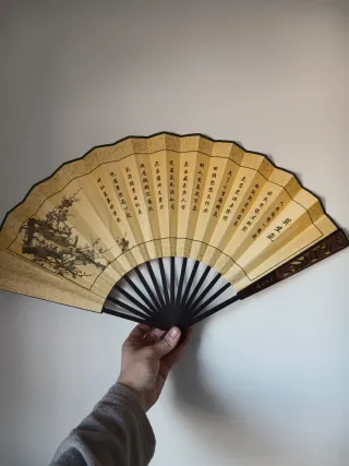 Abanico asiático en madera, tallado a mano. La tela es de seda. Mide 33cm de largo. Abierto mide 59cm de punta a punta. Es una preciosidad y está impecable.