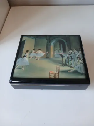 Elegante joyero musical con una escena de ballet pintada en la tapa. Está impecable. La melodía es el tema de Lara del dr. zhivago.