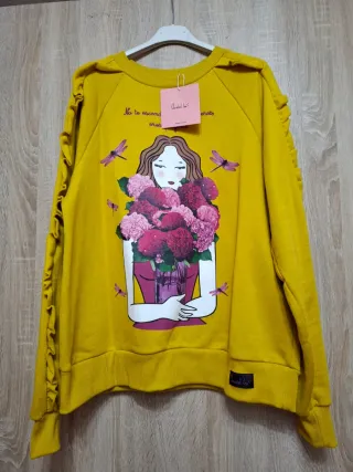 Sudadera con un diseño gráfico de una chica con flores y libélulas. Presenta detalles de volantes en las mangas. - Estampado frontal. - Cuello redondo. - Manga larga con volantes. SIN ESTRENAR CON ETIQUETA PRECIO ORIGINAL 65€
