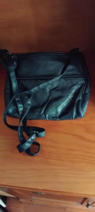 Bolso de piel con un diseño moderno y práctico. - Compartimento principal con cierre de cremallera. - Bolsillo frontal con botón a presión. - Correa ajustable para llevar al hombro o cruzado.