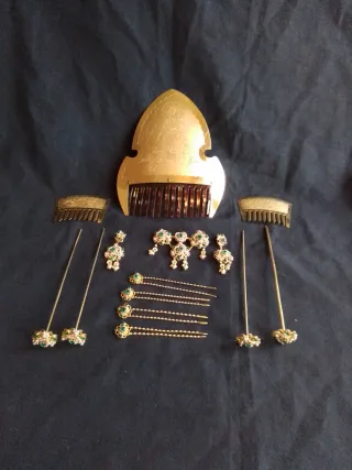 Conjunto de tocado de fallera con varios accesorios, la peineta es de carey, es de adulta - Tocado principal con diseño curvo. - Dos peinetas pequeñas. - Varios pasadores con adornos. - Pendientes a juego.