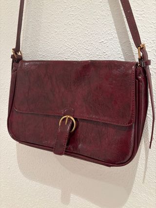 Elegante bolso de mujer en tono granate, con un diseño moderno y práctico. - Cierre con solapa y hebilla dorada. - Correa ajustable para llevar al hombro. - Acabado brillante.