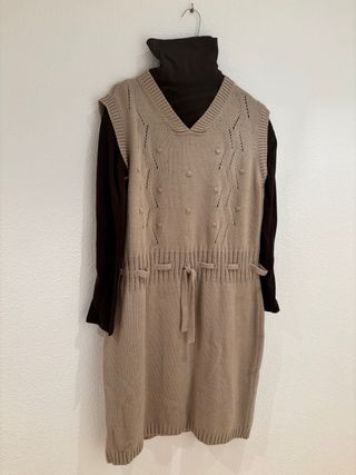Vestido de punto de manga larga con cuello alto y chaleco de punto con cuello en V. - Chaleco de punto con detalles calados y pompones. - Cintura ajustable con cordón. - Diseño de punto acanalado en puños y bajo.