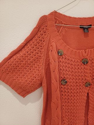 Chaqueta de punto con un diseño moderno y detalles cuidados. - Manga corta abullonada. - Cuello cuadrado. - Cierre con botones. - Tejido calado y trenzado.