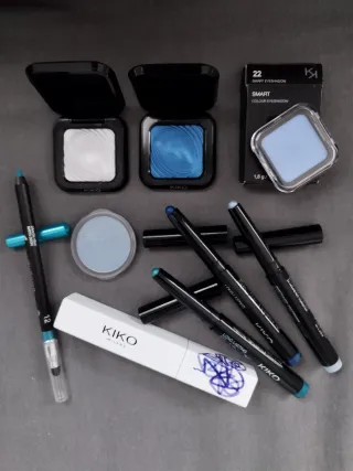 Lote productos de maquillaje de Kiko Milano. - Dos sombras de ojos water eyeshadow n° 1 y 19 - Sombra de ojos smart n° 22 - Sombras de ojos en stick n° 24, 25 y 28. Azul, plateado y verde - Un lápiz de ojos turquesa Long lasting Eyeliner n° 12 con pincel - Máscara de pestañas negra Street heart Instant volume