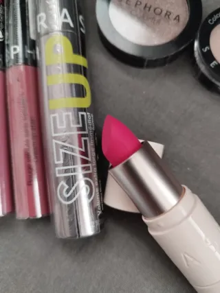 Conjunto de cosméticos de la marca Sephora. Todo nuevo sin estrenar y precintado, menos la barra de labios (sin estrenar pero sin precinto). - Tres labiales líquidos n ° 05, 06 y 85 - Eyeliner azul. - Máscara de pestañas Size Up volumen extra largo.Negro. - Sombra de ojos glitter n° 268 - Sombra de ojos nacré shimmer n° 281 - Barra de labios mate n° 10