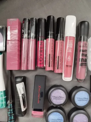 Lote cosméticos sin estrenar, muchos de ellos precintados. Incluye labiales, Eyeliners, lápiz de ojos, sombras de ojos, barras de labios. Diversas marcas: Sephora, Maybelline, Max factor, Essence, Catrice, Lovrén, Camaleón... Se vende el lote completo