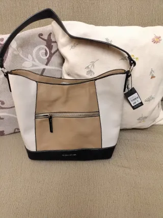 Bolso de mano con un diseño moderno y elegante, perfecto para el día a día. - Combinación de colores beige y blanco. - Bolsillo frontal con cremallera. - Asa cómoda para llevar al hombro.