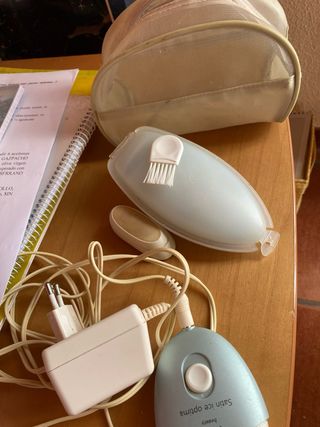 Depiladora Epilady con placa de frío incluida. Viene con su neceser y accesorios. - Depiladora con cabezal de frío. - Incluye pequeño cepillo limpiador. - Base de carga y adaptador de corriente. - Neceser de tela para guardarla.