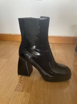 Botines de charol con un diseño moderno y atrevido. - Tacón grueso y cuadrado. - Plataforma delantera. - Cierre de cremallera lateral. - Detalle de tachuelas en la punta. - Talla 40