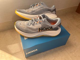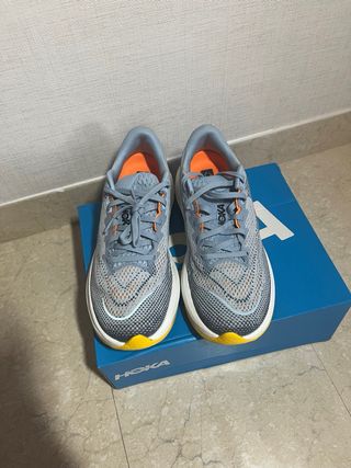 Las he usado para hacer 3km. Zapatillas Hoka Rincon 4 en talla 43. - Diseño en malla transpirable. - Detalles en color naranja. - Suela con amortiguación. - Logotipo Hoka en el lateral.