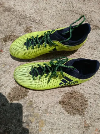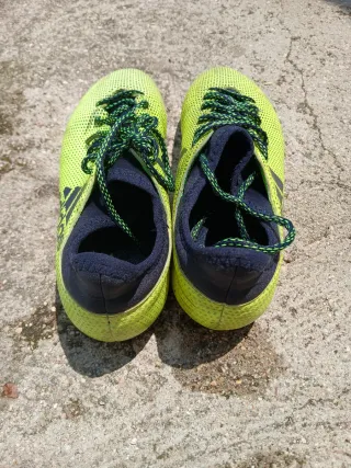 Botas de fútbol Adidas en llamativos tonos verdes y amarillos. Perfectas para destacar en el campo. - Diseño deportivo. - Cordones a juego.