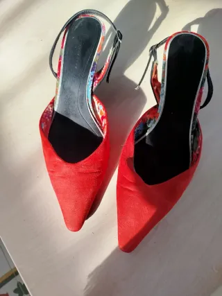 Elegantes zapatos mule con punta afilada. - Color naranja vibrante. - Diseño slingback con tira ajustable. - Interior con estampado floral llamativo.