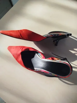 Elegantes zapatos de tacón destalonados. - Diseño abierto. - Tacón fino metalizado. - Punta cuadrada. - Solo puestos una vez