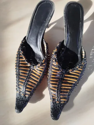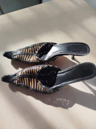 Elegantes zapatos tipo mule con punta afilada. - Diseño tejido en piel. - Tacón fino. - Muy pocos centímetros