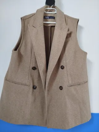 Chaleco de paño de Zara, ideal para añadir un toque elegante a tu atuendo. - Diseño de doble botonadura. - Bolsillos frontales. - Cuello solapa. - Tiene de desperfecto que se le forman motas muy pronto pero tan solo me lo he puesto una vez.