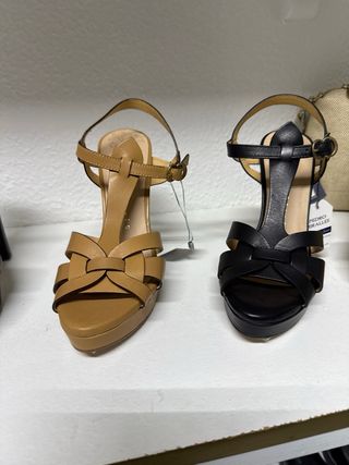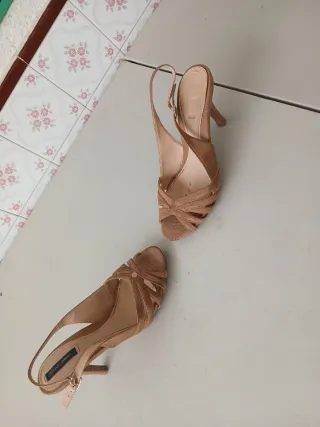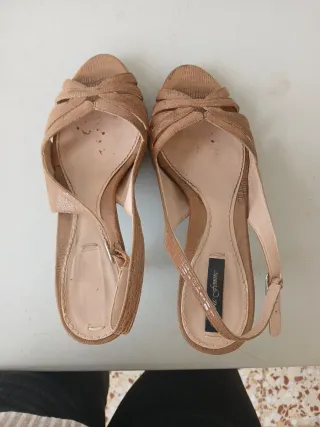 Elegantes tacones en tono beige y dorado, perfectos para complementar tu atuendo. - Diseño abierto. - Tira trasera con cierre de hebilla. - Detalle de tiras cruzadas en la parte delantera. - Marca visible en la plantilla.
