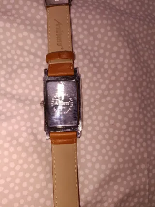 Reloj de pulsera con correa de cuero. - Correa de cuero marrón. - Caja plateada. - Esfera blanca con números. Sin caja