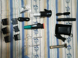 Completo set de peluquería para el cuidado personal. - Clipper VGR-003 con todas sus guías, cable y dos velocidades, la segunda de 9000 revoluciones. - Incluye un peine y un cepillo Fade. - Tijeras de entresacar y de cortar. - Shaber Kemei, con proyectar de cuchillas y todos los accesorios (funda y cable) - Viene con los aceites de cada maquina - la trimmer viene con protector y cabezales igual q la VGR - Difusor de agua Puedes pedir cosas por cosas si solo te interesa algo de todo lo que vendo y el precio es negociable, todas las cosas solo tienen 3 cortes, ya que con el instituto no las uso.