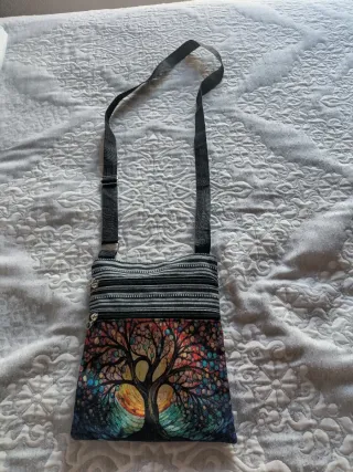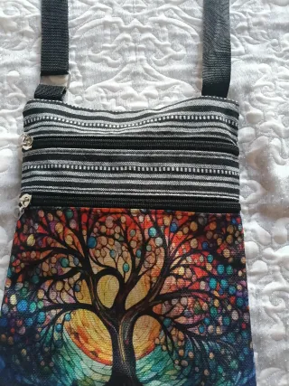 Bolso bandolera con un diseño vibrante del árbol de la vida. - Cierre con cremallera. - Correa ajustable. - Múltiples compartimentos.