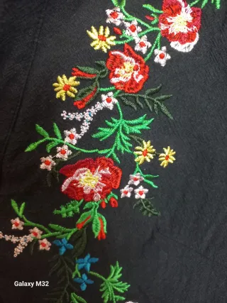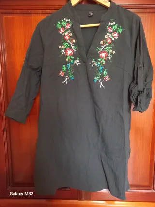 Vestido corto con un bonito bordado floral en la parte delantera. Ideal para un look casual y colorido. - Diseño con escote en V. - Mangas francesas con opción de remangarse. - Bordado multicolor con flores y hojas. Largo de vestido 85cm y largo de manga, 50.
