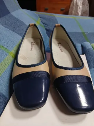 Elegantes zapatos planos para mujer, perfectos para cualquier ocasión. - Diseño bicolor en tono piel y azul marino. - Detalle de cinta de grosgrain azul. - Puntera cuadrada. - Logo de la marca en la plantilla.