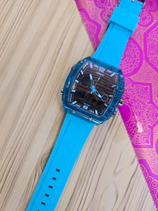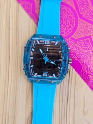 Reloj con correa de silicona azul y caja transparente. - Diseño moderno y llamativo. - Correa de silicona cómoda. - Caja de resina resistente.