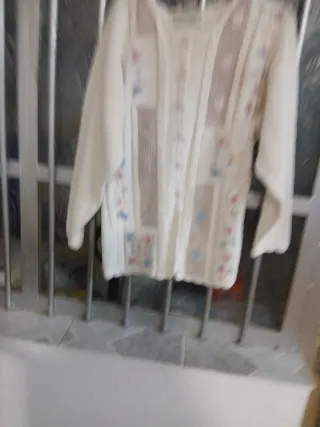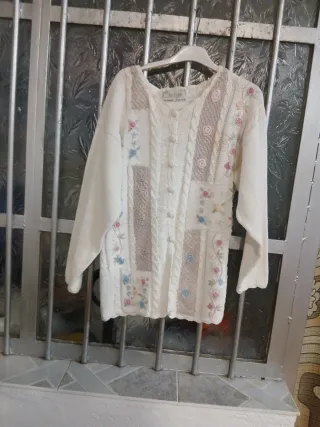 Rebeca de punto con detalles de perlas y flores bordadas. - Diseño patchwork. - Cierre de botones. - Manga larga.